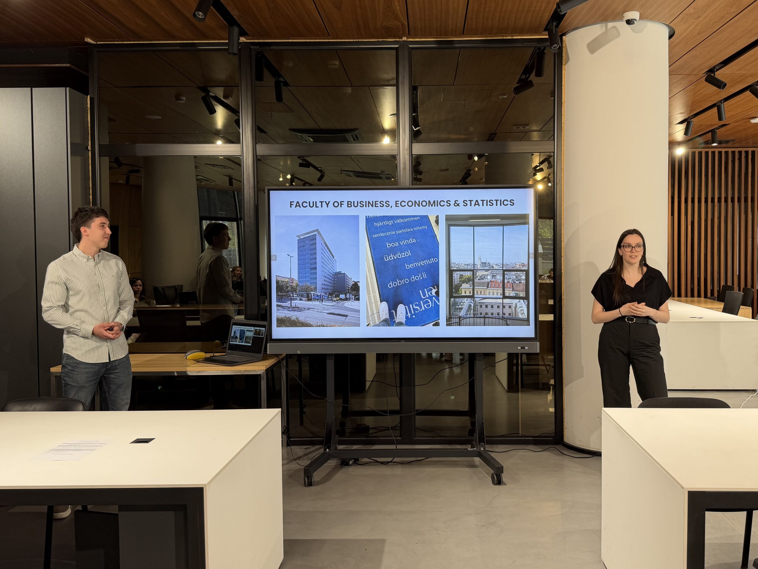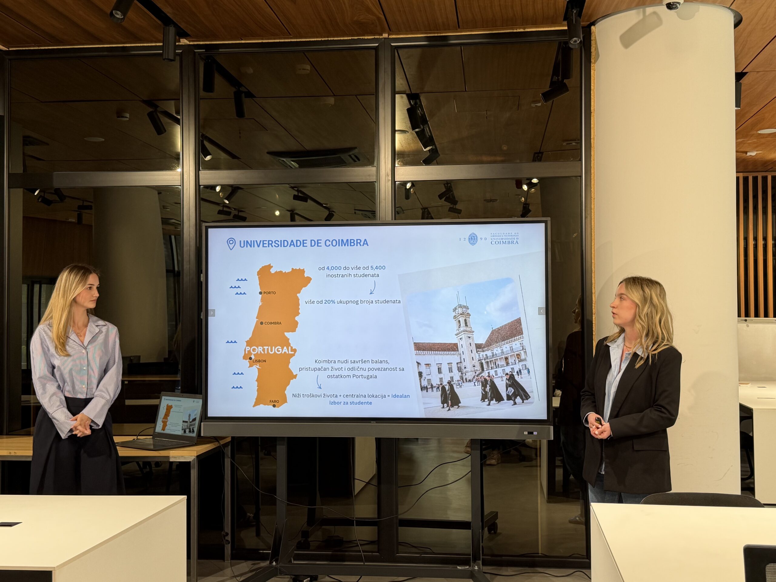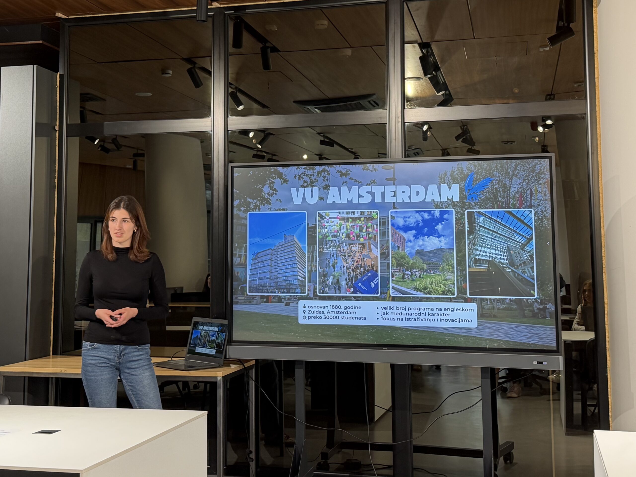 During the segment dedicated to student experiences at partner universities, Vanja Obradović and Marko Babić spoke about studying at the University of Vienna. For the first time this year, students Milica Mileusnić and Milica Miladinović presented their experience at the University of Coimbra, where they were also the first students from the Faculty of Organizational Sciences. Student Mila Mančić shared her experience and challenges of studying at VU Amsterdam, while Tara Popov presented her study experience at the University of Pisa in Italy.